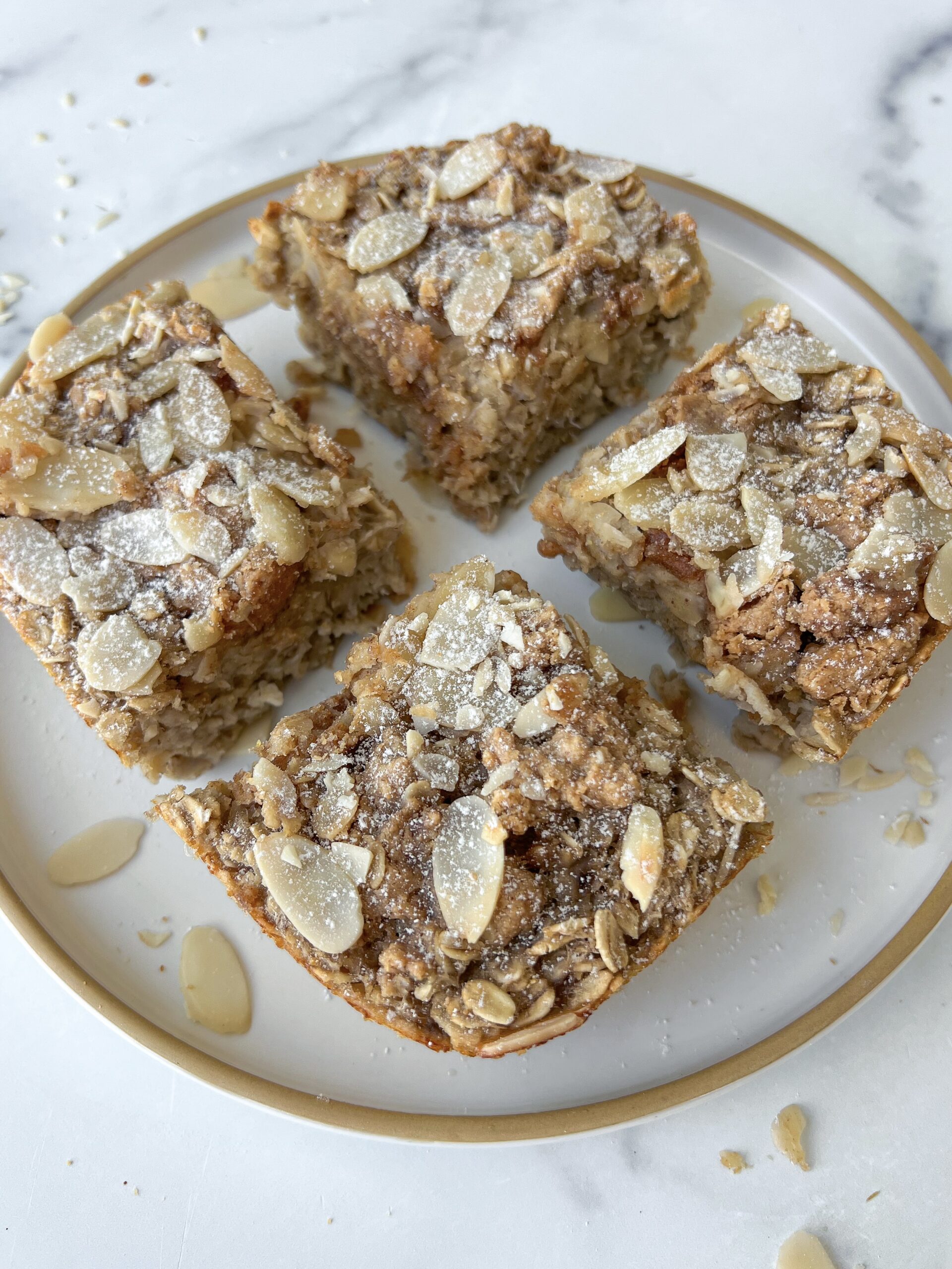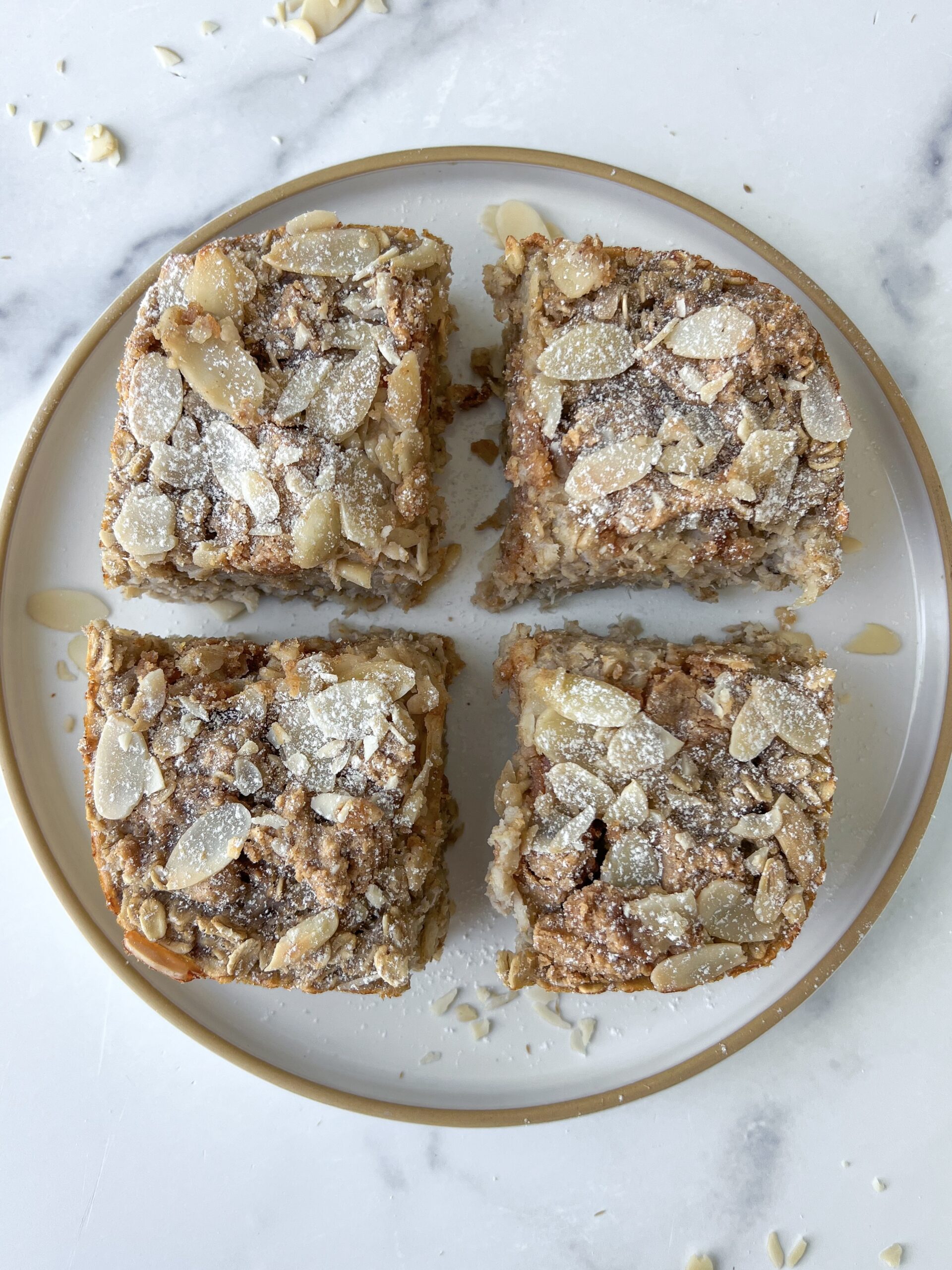- Let baked oats cool before slicing. Top with more almonds and an extra drizzle of maple syrup when serving.