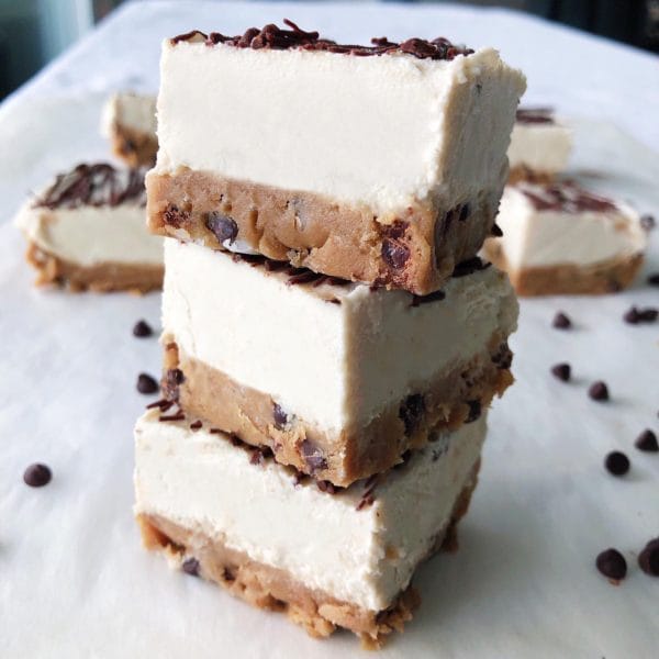 - Melt chocolate chips and coconut oil together in the microwave. Pour overtop of your cookie dough layer. Place pan back in the freezer until the chocolate hardens (about 30mins) and enjoy! Store in the freezer for best texture and let thaw 15 minutes before enjoying!