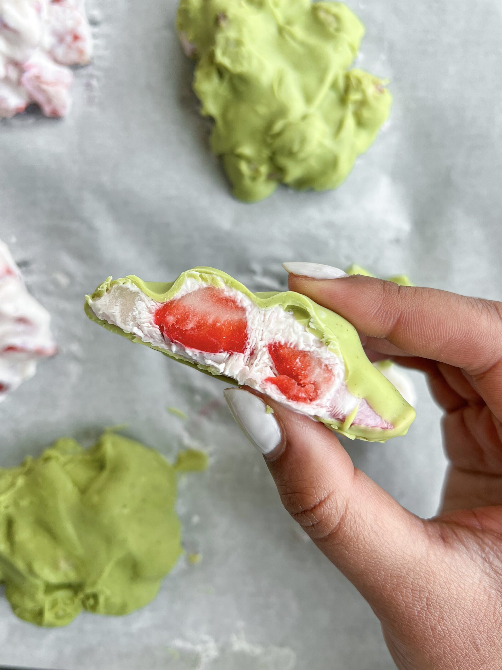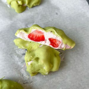 The matcha flavor is subtle and balanced by the white chocolate. If you prefer a stronger matcha taste, you can add an extra ½ teaspoon. Be sure to use good quality matcha for best strawberry matcha frozen clusters.