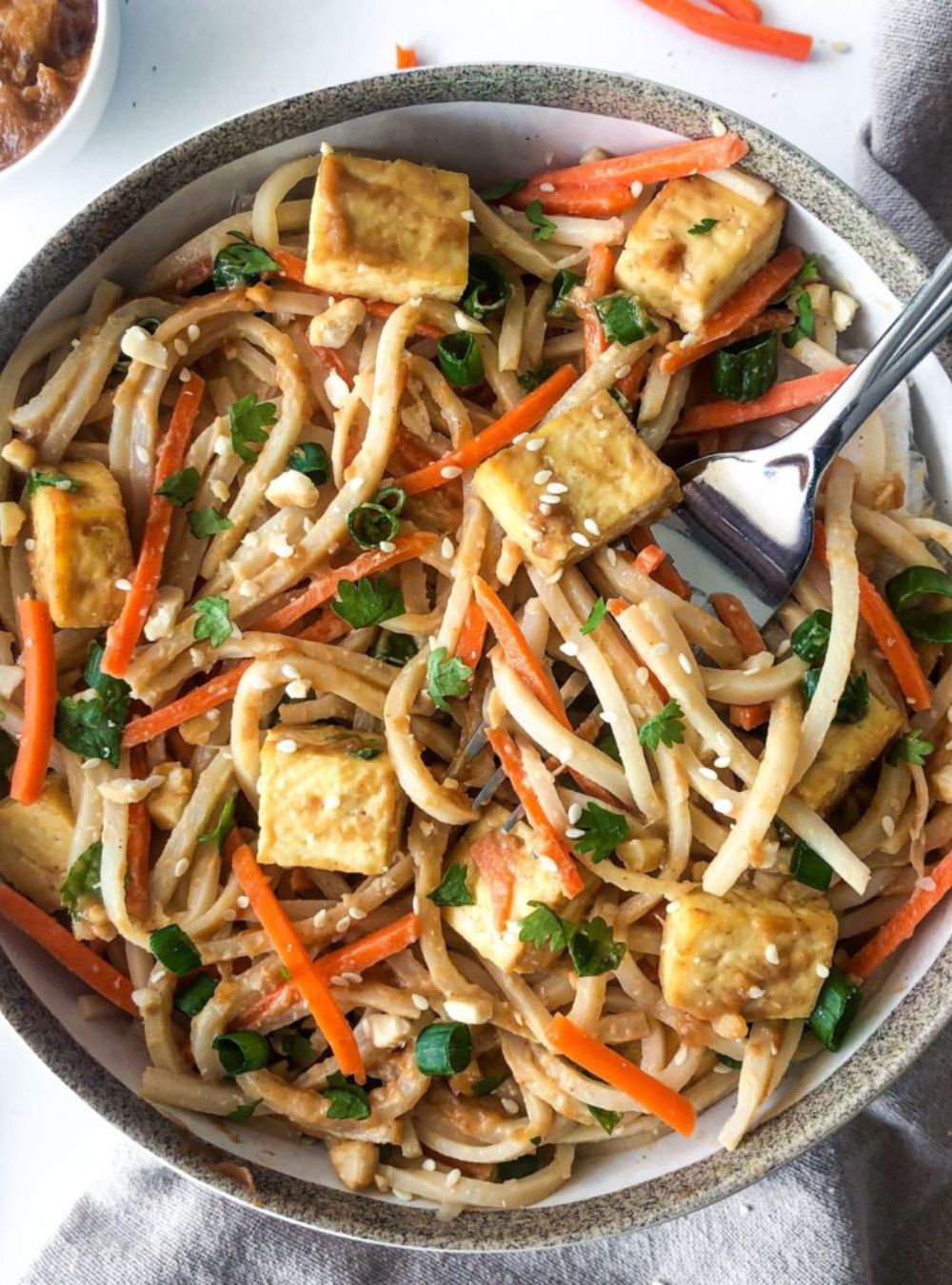 These thai peanut noodles with tofu are vegan, gluten free, and come together in just 20 minutes! Filled with crispy tofu and tossed with the most delicious, creamy peanut sauce. This healthy weeknight dinner is sure to be a total crowd pleaser!
