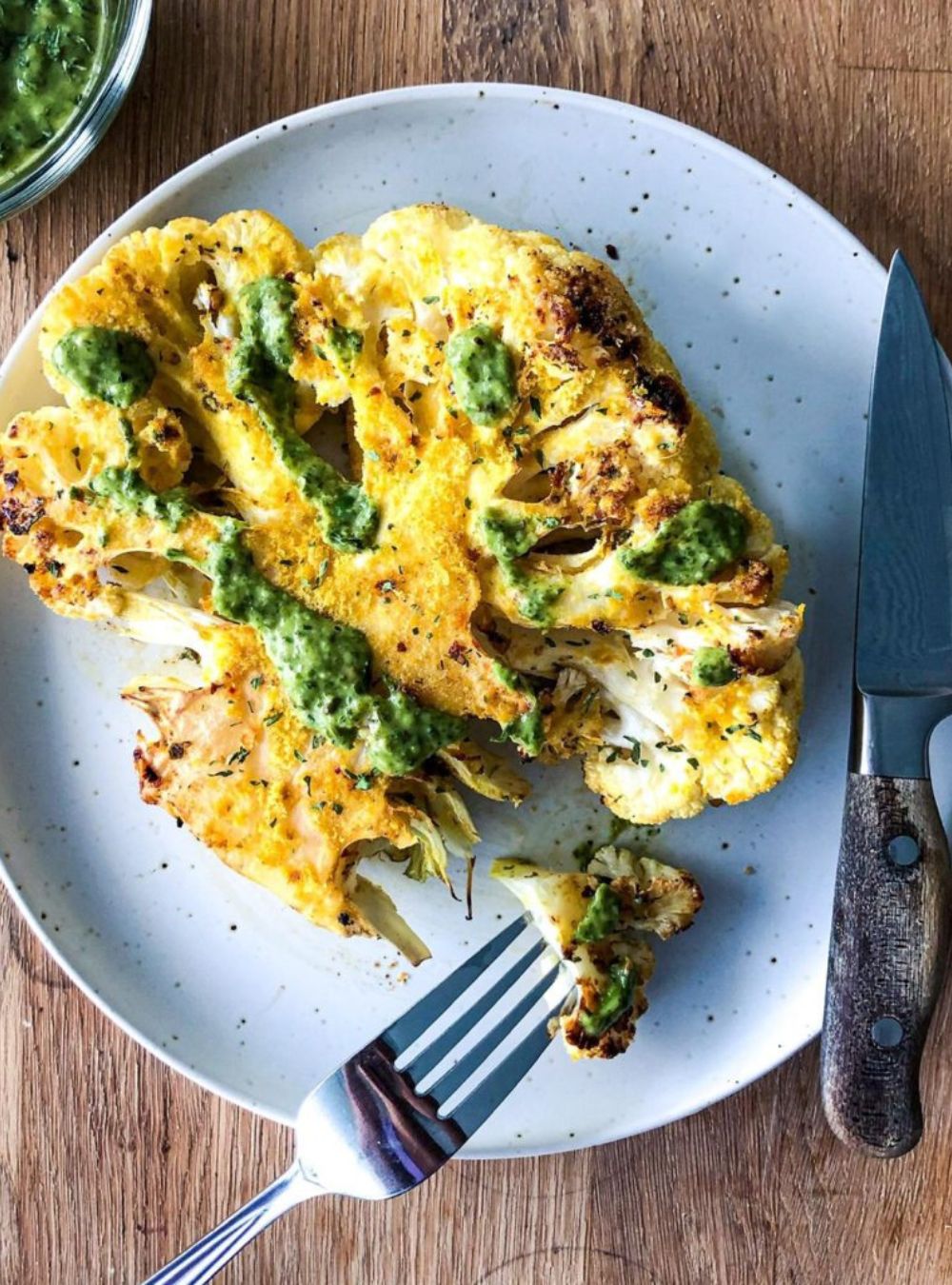 A nice change of pace for something special without extra effort. Thick slices of cauliflower roasted until tender with ultra crispy edges. It's finished with a homemade chimichurri sauce that brings the whole dish together.